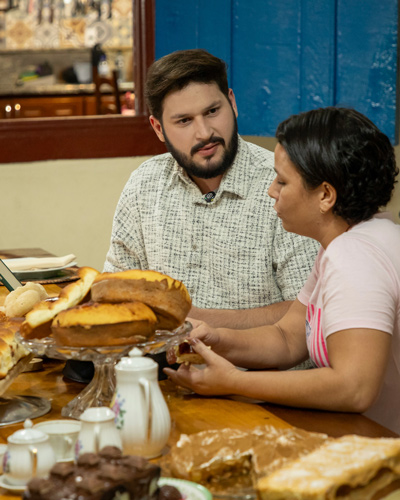 No programa, vamos bater um papo sobre a cidade com o diretor municipal de patrimônio histórico, Robson Augusto Moura. Na gastronomia, recebemos a quitandeira Flaviana Nunes, com um delicioso pão de cebola; a confeiteira Naiara Souza Braga, com doces e cafezinho; e a cozinheira Silvana Parreiras, que prepara um saboroso frango ao molho pardo, feito no fogão a lenha. Nas artes, teremos a presença de Jasmita Mita, com artesanato e missão, e do artista Pedro Gilbert, que embala o programa com música.